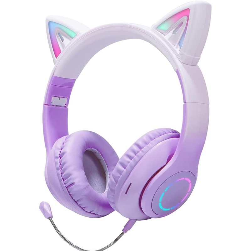 Ασύρματα ακουστικά Bluetooth για παιδιά Cat Ear με μικρόφωνο ακύρωσης θορύβου, LED με φωτισμό πάνω από το αυτί και στερεοφωνικό ήχο-Λιλά